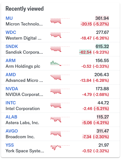 MU, SNDK, WDC 가 5일 거래 기준 -20% 하락 한 상황.