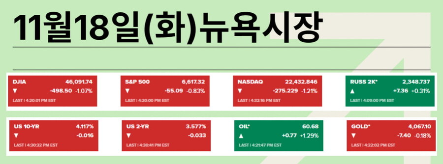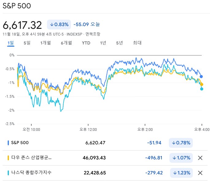 뉴욕 증시는 4거래일 연속 내림세를 보였습니다AI 버블 논쟁은 가라앉을 조짐을 보이지 않고 있습니다알파벳의 순다르 피차이 CEO의 “AI 붐에 비이성적 측면이 있다”라는 발언이 경계심을 자극했고요알파벳이 더 진화한 제미나이 3.0을 선보이고, 메타는 반독점 소송이 기각됐지만, 이들의 주가 조차 오르지 못했습니다홈디포는 실망스러운 실적을 내놓아 시장 불안을 가중했고요, 내일 엔비디아의 실적 발표를 앞둔 관망세도 나타났습니다. 엔비디아의 시가총액은 S&P500 지수의 약 7%에 달하기 때문에 시장에 큰 영향을 미칠 수 있습니다.