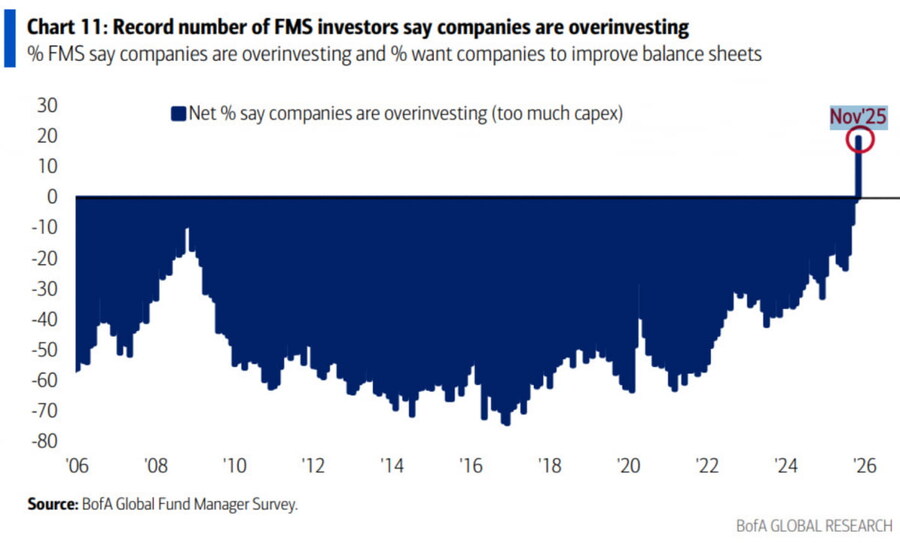 • BofA 서베이: 글로벌 펀드매니저의 45%가 'AI 버블'을 시장의 가장 큰 위험으로 지목. 20년 만에 처음으로 '기업들이 과잉투자를 하고 있다'는 응답이 우세.