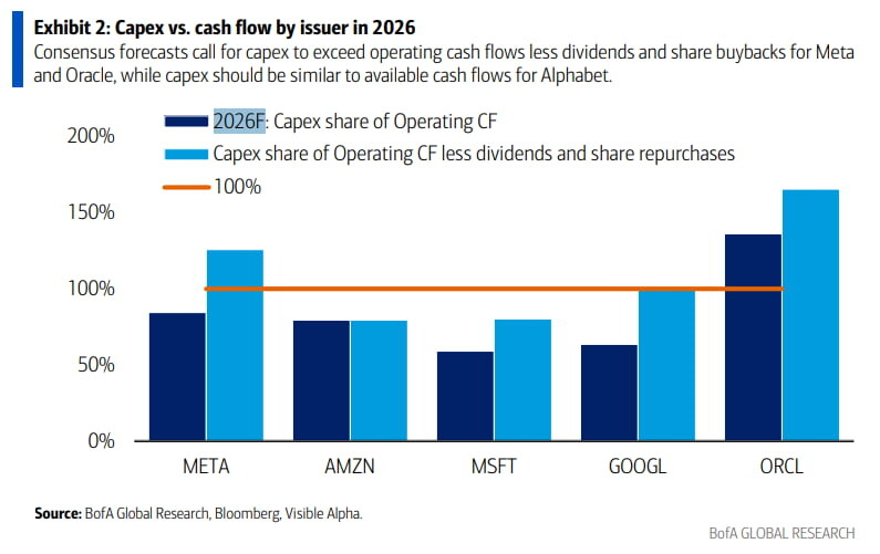 2026년 기업별 자본지출(Capex) 대 현금흐름 비교 (자료: 뱅크오브아메리카)