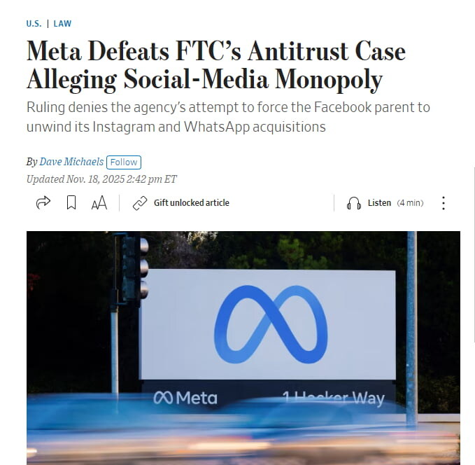 • 메타 반독점 소송 기각: 연방법원이 FTC의 입증 부족을 이유로 소송을 기각하며 주가 방어.