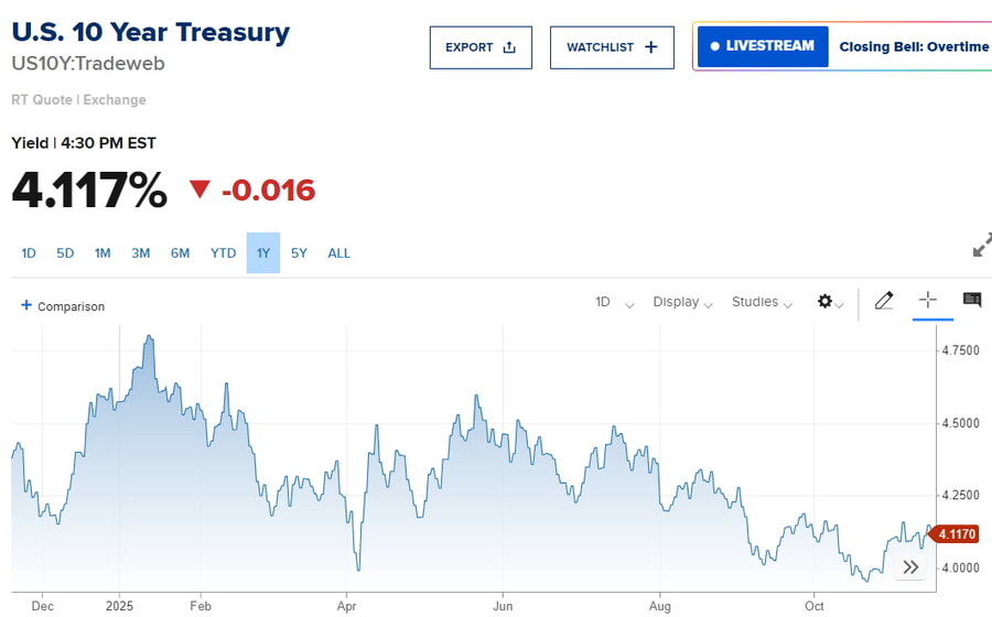뉴욕 채권 시장에서 금리도 소폭 내렸습니다. 오후 4시 10분께 국채 10년물 수익률은 1.6bp 하락한 4.117%, 2년물은 3.5bp 내린 3.575%를 기록했습니다.