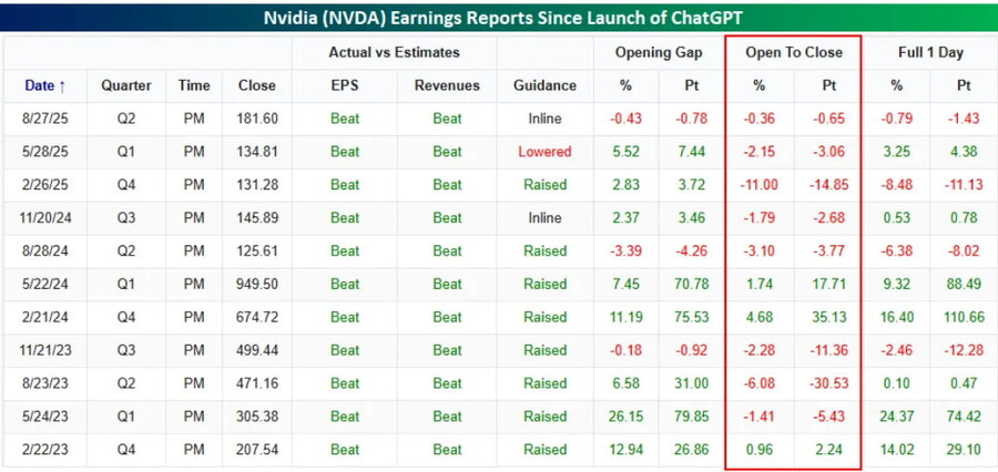 비스포크인베스트먼트에 따르면 엔비디아의 실적 발표에 대한 시장 반응은 최근 그리 좋지는 않습니다지난 11번의 실적 발표 이후 다음 날 8번 상승했었는데요문제는 개장 직후 뛰었던 주가가 종가 기준으로는 그보다 낮게 마감한 경우가 8번이나 있었습니다최근 5개 분기 모두 그랬고요. 비스포크는 "전반적으로 좋은 실적에도 불구하고 투자자들은 계속 계산기를 돌렸다"라고 분석했습니다.