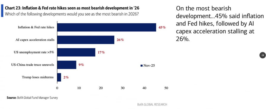 내년 최대 위험으로는 45%가 인플레이션 상승 및 Fed 금리 인상을 들었습니다두 번째로 큰 위험은 26%가 꼽은 AI 투자 침체였습니다.