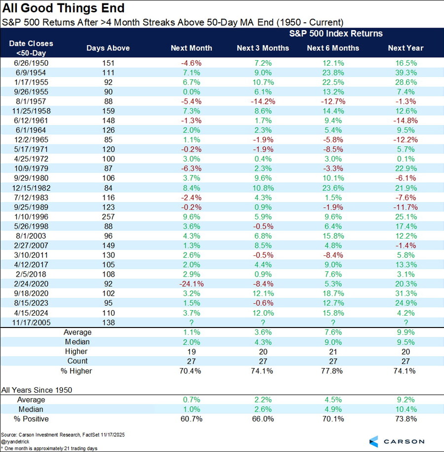 S&P500 지수가 장기간(4개월 이상) 50일 이동평균선 위를 지키다가, 그 아래로 떨어졌을 때 이후 주가 흐름
