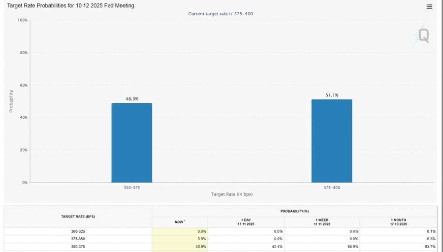 약간 부정적인 고용 데이터가 나오면서 시카고상품거래소(CME) Fed워치 시장에서의 12월 금리 인하 확률은 오후 4시께 48.9%로 어제 42.4%보다 조금 높아졌습니다.
