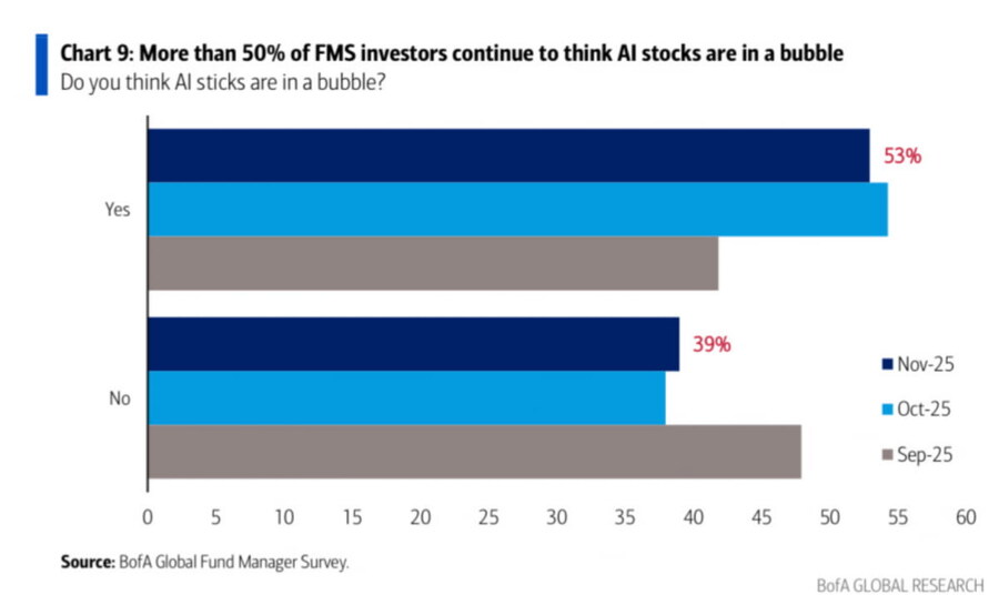뱅크오브아메리카는 오늘 11월 글로벌펀드매니저 설문조사(FMS) 결과를 발표했는데요응답자의 45%가 AI 버블이 가장 큰 위험이라고 답했습니다또 53%가 AI 주식이 버블에 있다고했고요응답자의 순 20%는 기업들이 과잉투자를 하고 있다고 지적했습니다이는 2005년 8월 설문조사 실시 이후 20년 만에 처음으로 '그렇다'라는 답이 '그렇지 않다'라는 답보다 많아진 것입니다. AI 투자에 대한 걱정이 반영된 것이죠.