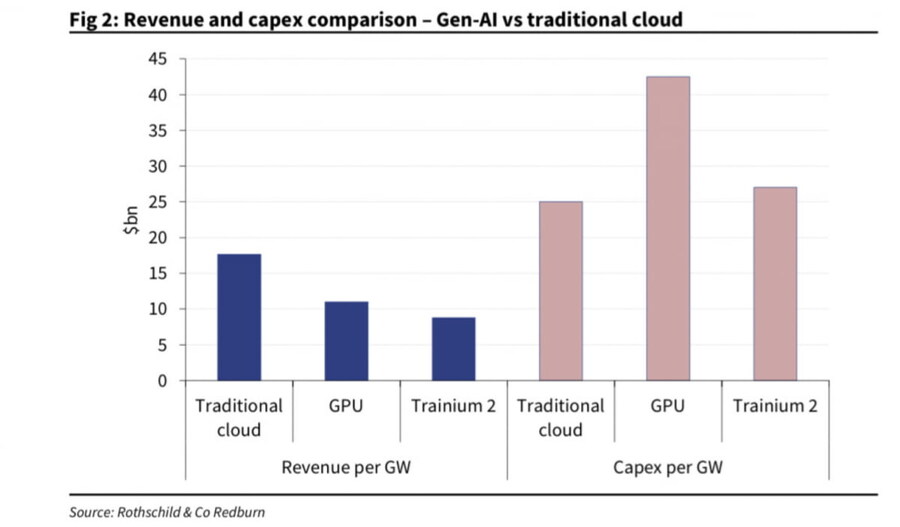 수익(Revenue)과 설비투자(Capex) 비교: 생성형 AI vs 전통적 클라우드 (출처: 로스차일드앤코)