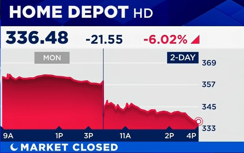 • 홈디포 실적 쇼크: 이익(EPS)이 예상치를 밑돌고 가이던스를 하향. 고금리와 주택 시장 침체가 주택 개량 수요를 억제.