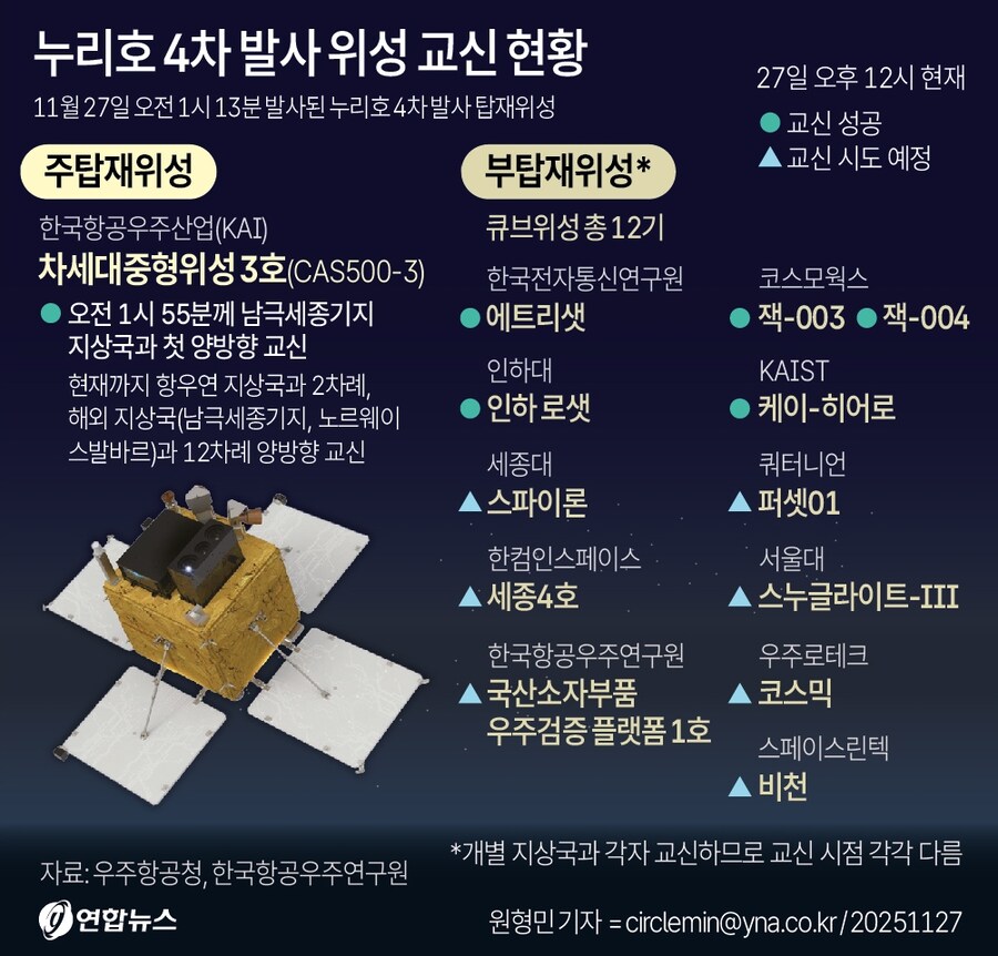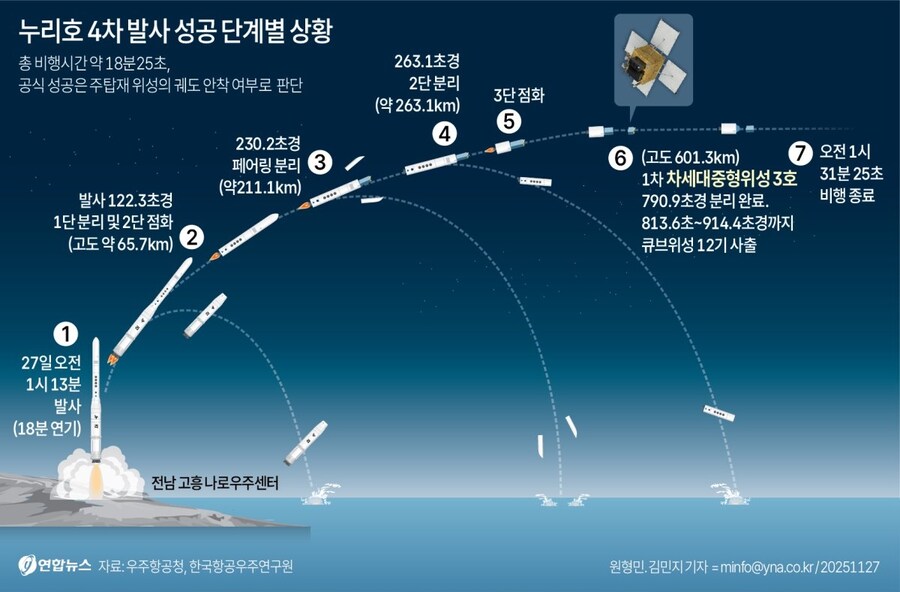 ▷언론에 따르면, 최초로 민간주도로 제작된 한국형발사체 누리호(KSLV-II)가 27일 성공적으로 발사돼 탑재위성들을 계획된 궤도에 안착시킨 것으로 전해짐. 우주항공청과 항공우주연구원에 따르면 누리호는 이륙 후 122.3초쯤 고도 약 65.7㎞에서 1단 분리 및 2단 점화, 230.2초쯤 고도 약 211.1㎞에서 페어링 분리, 263.1초쯤 고도 약 263㎞에서 2단 분리 및 3단 점화까지 진행 후 741.2초쯤 고도 600.5㎞에 도달했음. 이후 자세 안정화 과정을 거쳐 790.9초쯤 고도 601.3㎞에서 차세대 중형위성 3호를 분리했으며 813.6초경부터 914.4초경까지 12기 큐브위성을 정해진 순서대로 모두 성공적으로 분리한 것으로 전해짐.