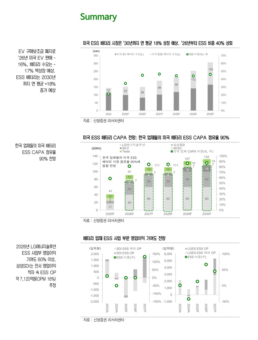 ▷신영증권은 보고서를 통해 ESS의 적용 저변 확대와 미국의 탈중국 공급망 강화 기조가 맞물리며 올해 하반기 국내 주요 이차전지 업체들의 24MF P/E는 평균 70% 상승했다며, 26년에도 데이터센터 온사이트 전원 확대, 부하 변동 안정화를 위한 AI 데이터센터 내 ESS 도입 증가 흐름이 이어지며 미국 ESS 시장 성장 기대감은 이어질 전망이라고 밝힘. 미국 현지 Non-PFE ESS용 배터리 셀 수요가 증가하는 과정에서 한국 업체들의 CAPA 점유율은 약 90%에 이르며 시장을 장악할 수 있는 환경이 조성될 전망이라며, 배터리 셀, LFP 양극재 업체를 중심으로 신규 수주 기회가 이어질 가능성이 높다고 분석. 이어 2027년 기준 LG에너지솔루션의 ESS 사업부문 연결 영업이익 기여도는 47%에 달할 전망이라고 설명.