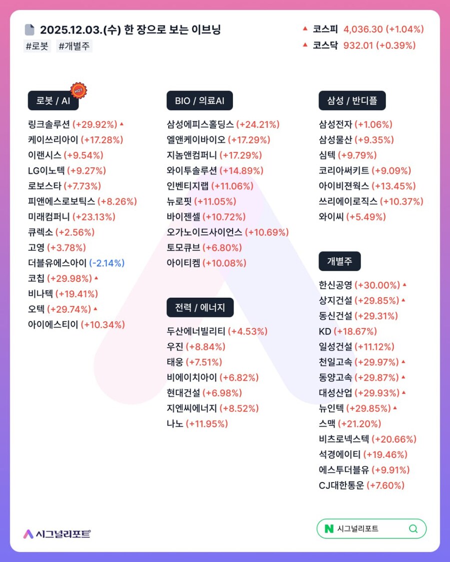 ■ 강세 테마 : 건설 중소형, 3D 프린터, MLCC(적층세라믹콘덴서), 코로나19(음압병실/음압구급차), 핵융합에너지, LPG(액화석유가스), 모듈러주택, 건설 대표주, 자원개발, 조림사업, 수산, 공기청정기, 유리 기판, 스마트그리드(지능형전력망), 항공기부품, 우 주항공산업(누리호/인공위성 등), PCB(FPCB 등), LED장비, UAM(도심항공모빌리티), 원자력발전, 여행, 종합상사, 도시가스, 쿠팡(coupang), 타이어, 전력설비, 통신, 인터넷 대표주, 공작기계, 스마트팩토리(스마트공장), 아이폰, 로봇(산업용/협동로봇 등) 등...