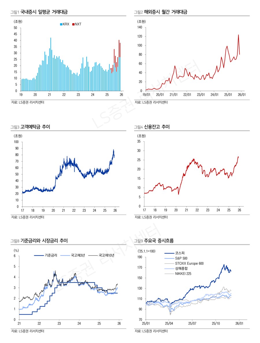 ▷LS증권은 증권 업종에 대해 4Q 브로커리지 관련수익이 대폭 개선될 것으로 전망. 11월 국내증시 일평균 거래대금(KRX+NXT)은 38.0조원으로 10월(40.3조원)에 이어 역대 최대수준을 기록했으며, 11월 중순 이후로는 시장변동성 확대와 함께 30조원대 초반 수준으로 감소했으나, 4분기 현재까지의 일평균 거래대금이 38.9조원을 기록하고 있어, 3분기의 25.7조원에 비해 51% 급증한 상태라고 설명. 해외증시 월간거래대금 역시 3분기 대비 4분기 현재까지의 증가율이 40%에 달하며, 고객예탁금은 11월초 88조원까지 급증한 이후 현재는 80조원 부근을 기록 중이고, 신용잔고 역시 26.5조원으로 지난 9월말 23.5조원에 비해 상승했다고 밝힘.