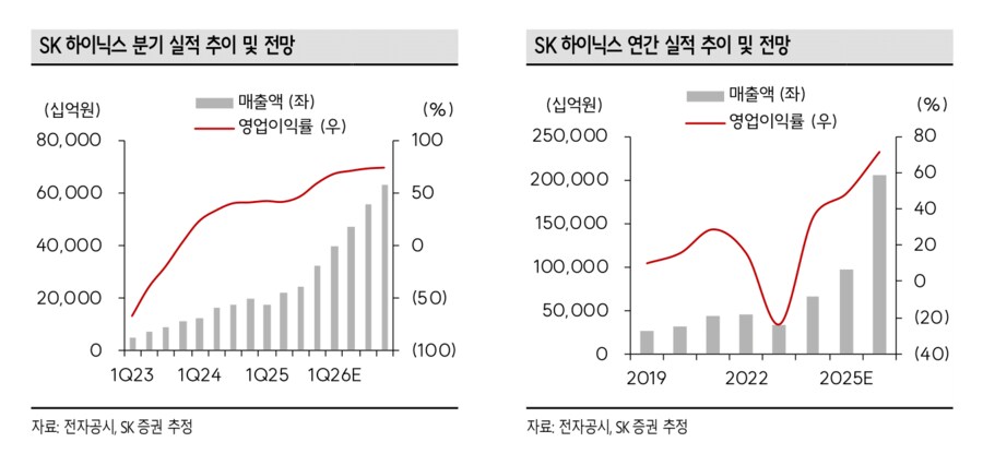 ▷SK증권은 삼성전자에 대해 기존 예상을 상회하는 강력한 메모리 업황을 반영해 2026E 메모리 가격 상승률을 DRAM +111%, NAND +87%로 상향 조정했다며, 2026년 영업이익은 180조원(+314% YoY), 영업이익률 37%(+27%p YoY)로 이익, 수익성 모두 사상 최대를 기록할 것으로 전망. SK하이닉스에 대해서도 2026년 영업이익은 147조원(+213% YoY), 영업이익률 72% (+23%p YoY)로 이익, 수익성 모두 사상 최대를 기록할 것으로 전망. 아울러 폭력적인 메모리 가격 상승에 따른 단기 실적 눈높이의 급격한 상향은 필연적으로 미래 성장률 둔화를 내포하고, 설비투자 확대 역시 미래의 초과 공급 우려에 따른 Peak-out 명분이 아닌 계약 기반의 높은 수요 확인의 지표가 될 것이라고 밝힘.
