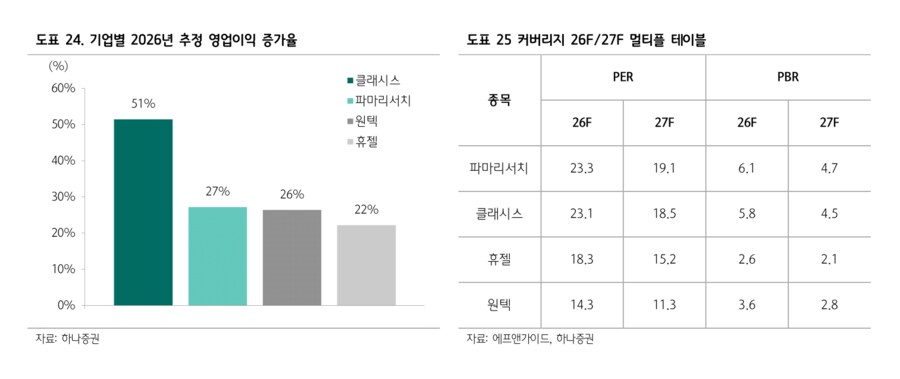 ▷하나증권은 보고서를 통해 2026년 미용 의료 섹터는 한 층 확대되는 기업들의 해외 진출, 방한 관광객이 주도하는 내수 시장 외형 확대, 그리고 신생 블록버스터 ECM 스킨부스터가 이끄는 기타 인젝터블 업종 성장으로 다시 기대감을 회복할 것이라고 밝힘. 2025년 미용 의료 섹터 수익률은 시장대비 부진했는데, 이는 실적 둔화가 아닌 멀티플 하락에 기인하는 것으로 분석. 과거 섹터 밸류에이션이 큰 폭으로 하락한 경우는 수출과 사업 중단 리스크가 불거질 때였는데, 수출 및 사업 중단 관련 리스크가 부재함을 감안 시 현재 주가는 펀더멘털 대비 과도하게 낮다고 판단된다고 밝힘.