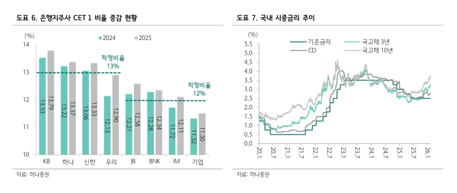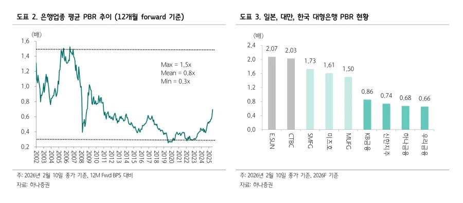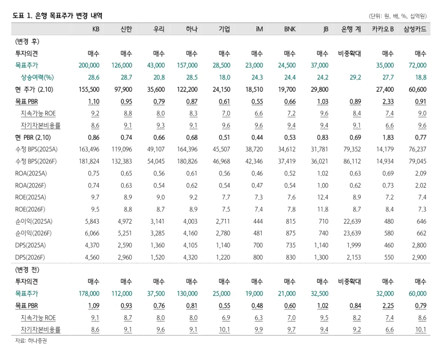 ▷하나증권은 은행업종에 대한 투자의견 비중확대를 유지하고, 모든 은행지주사들의 목표주가를 상향한다고 밝힘. 은행 목표주가를 상향한 배경은 2025년 실적 공시가 마무리됨에 따라 PBR valuation시 적용하던 BPS 기준을 2025년에서 2026년으로 변경했고, CET 1 비율이 상대적으로 낮아 그동안 타행대비 더 높은 리스크프리미엄을 적용했던 우리금융과 중소형은행들의 경우 양호한 자본비율 방어력과 큰폭의 총주주환원율 상승 전망 등을 감안해 자기자본비용률을 소폭 하향했으며, 2026년 이익추정치 상향으로 은행들의 지속가능 ROE 또한 소폭 상향적용했기 때문이라고 분석. 이에 따라 기존 약 0.85배 수준이었던 은행 평균 목표 PBR을 약 0.90배 수준으로 올렸고, 여기에 BPS 기준 변경까지 감안해 은행들의 목표주가를 평균 약 15% 내외 상향. 2026F 기준 현 은행 평균 PBR은 약 0.69배로 추가 상승 여력은 약 30% 이상으로 판단.