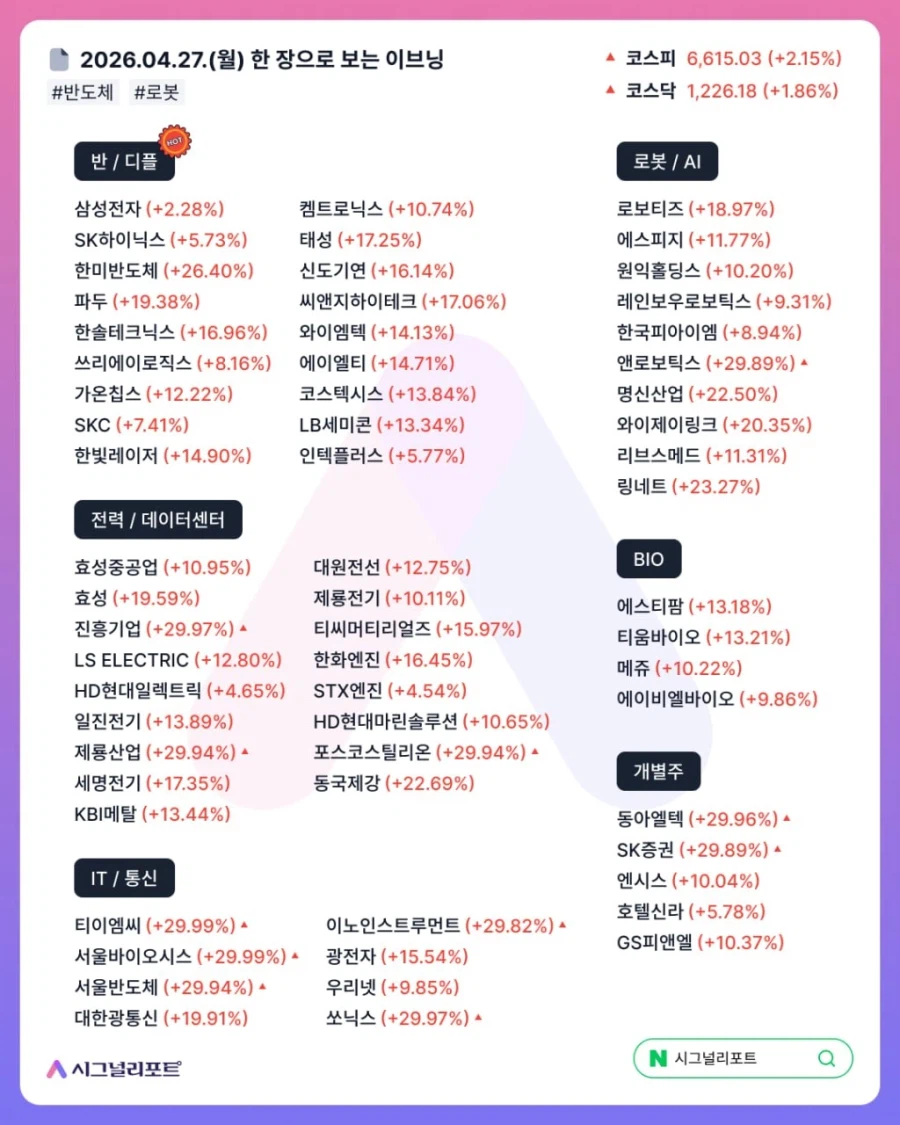 오늘 양 시장 강세는 AI 밸류체인이 주도했습니다. 반도체·전력기기 강세(효성중공업 +11.0%, LS ELECTRIC +12.8%) 지속됐고 자동화 관심 확대에 피지컬AI(현대차 +2.1%, 로보티즈 +19.0%) 부각됐습니다. 여기에 철강(포스코스틸리온 上)·조선기자재(한화엔진 +16.5%)도 데이터센터향 납품 기대감에 상승했습니다.